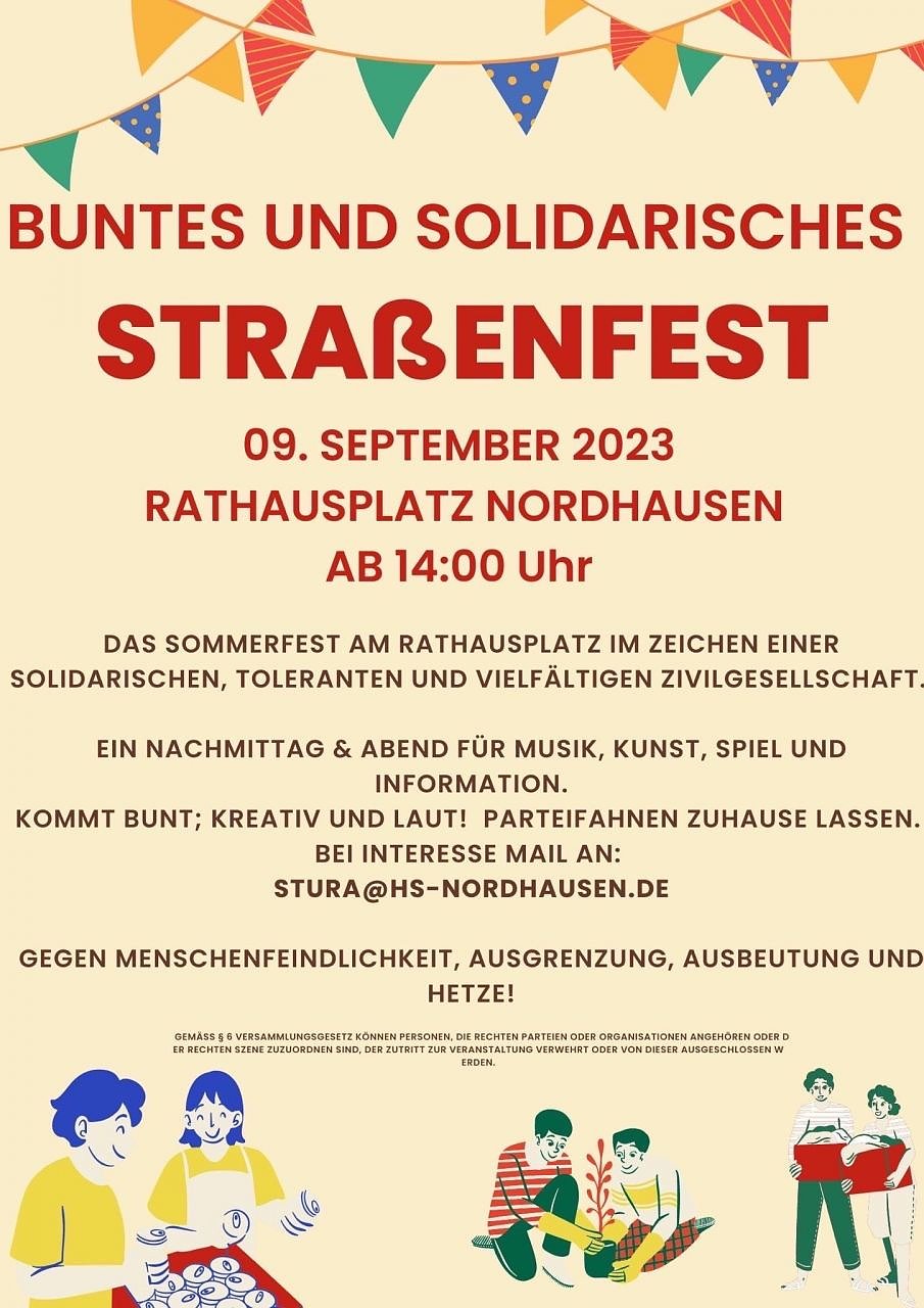 - 9.9.23, von 14 bis 22 Uhr beim Bunten und Solidarischen Straßenfest des Stura der Hochschule (Anmeldung von Informations- und Mitmachständen unter: stura@hs-nordhausen.de)