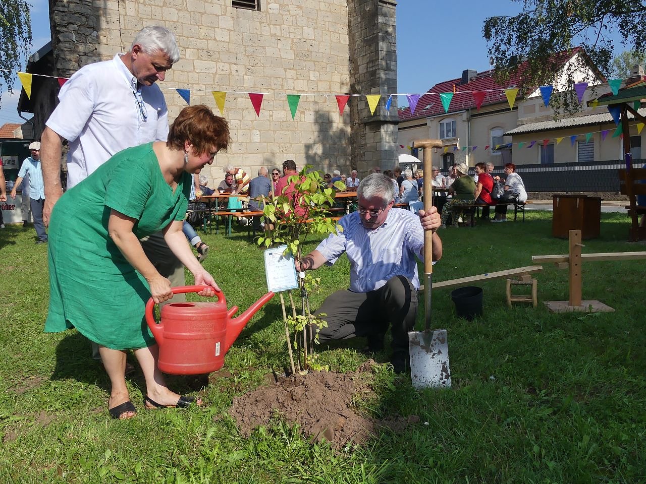 Übergeben wurden die Urkunden vom Vorsitzenden des Kirchenbauvereins Stephan Domann, Sollstedts Bürgermeister Tobias Tressel, Ortsteilbürgermeisterin Dagmar Becker und Superintendent Andreas Schwarze. Der Superintendent hielt noch ein kleines Extra-Geschenk für Helga Rathnau bereit – eine Arbeitsschürze mit der Stickerei Unser tägliches Brot gib uns heute. Das Ehepaar Krischeu trug einen großen Präsentkorb nach Hause und für Englerts hatte es zur Glockenweihe am 20. August bereits einen Bienenbaum gegeben, der nun die Kirchwiese in Elende ziert. Superintendent Andreas Schwarze und seine Frau Kathrin hatten ihn gleich nach dem Gottesdienst eingepflanzt.