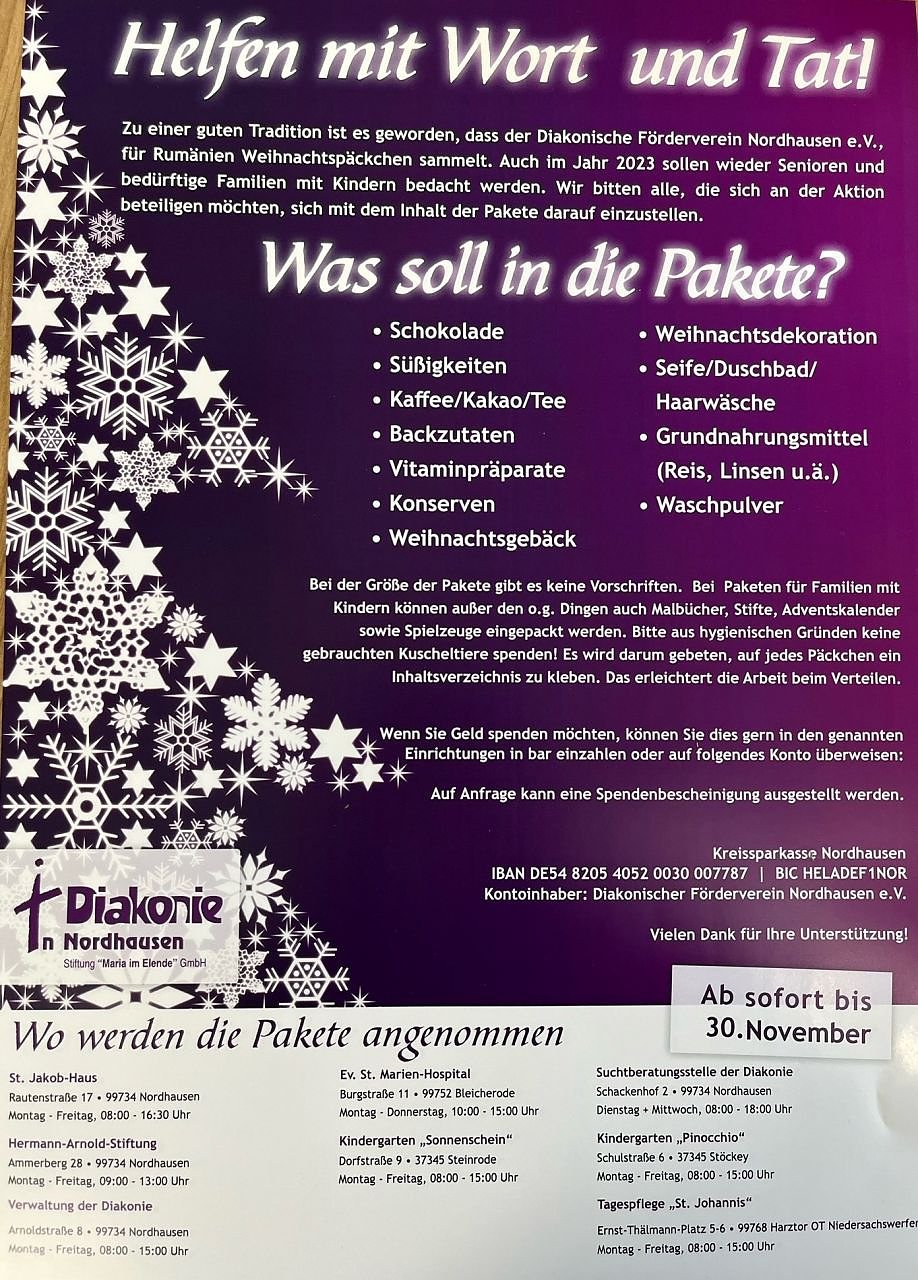 Auch im Jahr 2023 sammelt der Diakonische Förderverein Nordhausen e.V. Weihnachtspäckchen und Hilfsgüter. Der Transport startet im Dezember 2023.