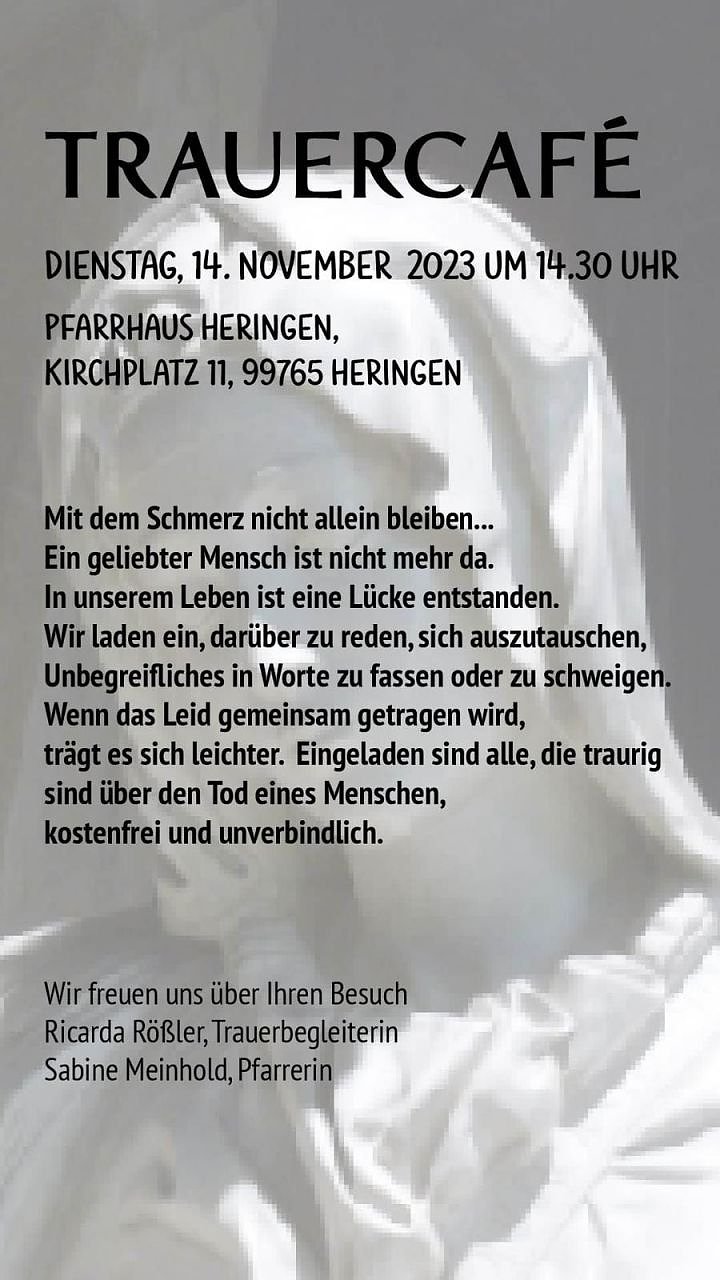 In der Regel jeden 2. Dienstag im Monat (14.11.) ab 14.30 Uhr bietet die Kirchengemeinde Heringen mit Pfarrerin Sabine Meinhold und Trauerbegleiterin Ricarda Rößler die Möglichkeit, unter fachlicher Begleitung, miteinander ins Gespräch zu kommen.