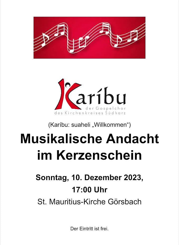 (re) Herzliche Einladung zur musikalischen Andacht mit Kerzenschein am 2. Advent mit dem Gospelchor Karíbu in Görsbach - Sonntag, 10.12., 17 Uhr, St.-Mauritius-Kirche.