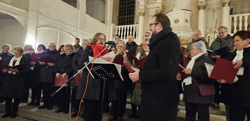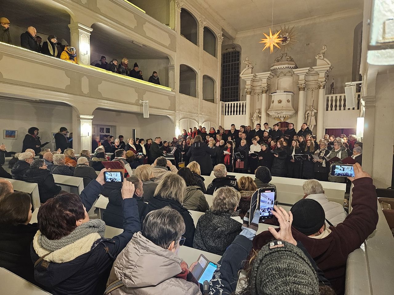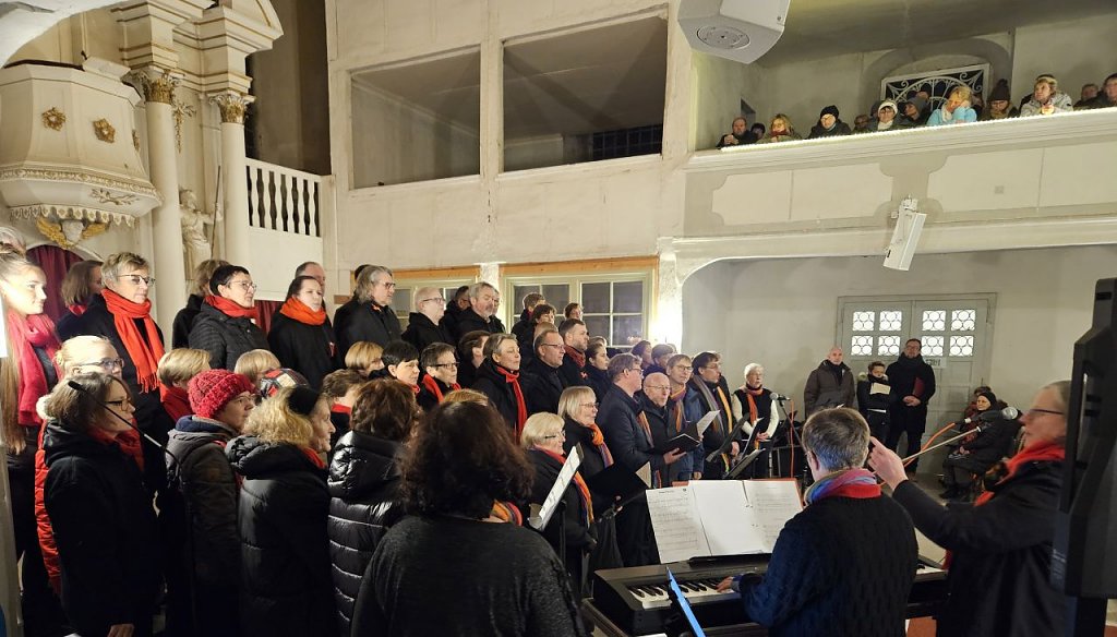 Bereits als Superintendent Andreas Schwarze und Matthias Marquardt, Bürgermeister der Landgemeinde Heringen, die rund 500 Konzertbesucher in St. Michaelis begrüßen, lässt sie der Anblick der vollen Kirche und der vielen Sängerinnen und Sänger staunen. Alle sind gekommen, um ein Zeichen der Solidarität zu setzen, zu unterstützen. Gospel- und Kirchenchöre, ein Frauen-Quintett zudem ein Jugend- und Kammerchor, sowie Paula Manzke mit Gerald Michael Fähnrich stehen auf dem Ablaufplan, den Viola Kremzow erstellt hat. Mit jedem Lied steigt am Sonntagabend die Stimmung der Besucher in der kalten Kirche. Immer wieder füllen neue Chöre und Ensembles den Altarraum und präsentieren ihr ausgewähltes Repertoire. Es wird geschnippt, gewippt und geklatscht. Es wird fasziniert gelauscht und manchmal auch der Atem angehalten. Unzählige Stimmen füllen die Kirche. Unzählige Besucher sitzen in den Bänken und auf den Emporen. Und das Kamerateam des MDR immer mittendrin. Mit einem großen Lächeln im Gesicht dirigiert Viola Kremzow alle Singenden gemeinsam, als das Lied zur Jahreslosung erklingt. Ein Lächeln, das kurz darauf zuerst einem staunenden, dann einem sichtlich berührten Blick weicht. Der Grund ist ein kleiner Zettel, den ihr Pfarrerin Sabine Meinhold übergibt. Auf ihm steht die Spendensumme des Abends. Sofort brandet Applaus durch das Gotteshaus. Jeder dankt jedem, für den Gesang, für die Spende, für dieses große Zeichen der Solidarität. Ein warmes Gefühl des Miteinander flutet den Kirchenraum.